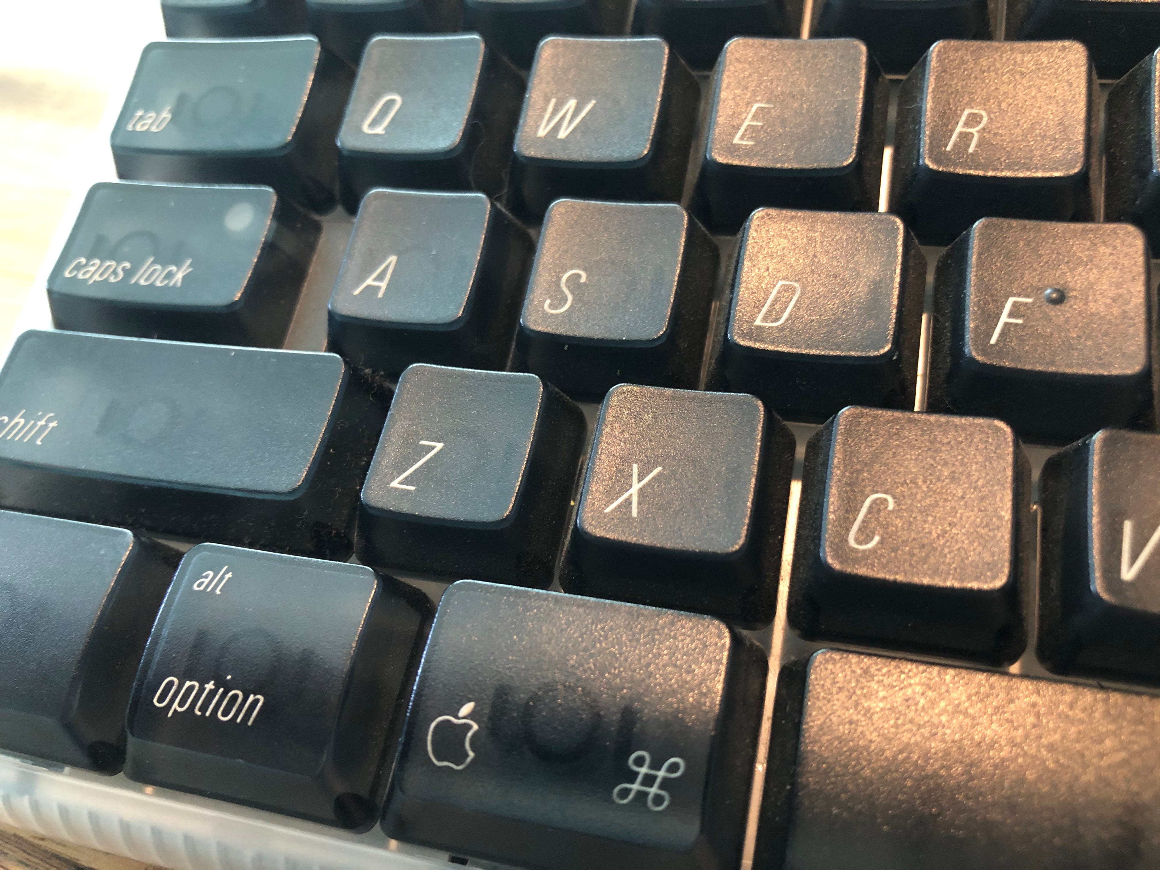 With the keyboard tested, it was time to start cleaning it. This model, if I am not mistaken is from the G3 and early G4 era of iMac and PowerMac — circa 1998-1999 — so it was quite dirty. The key layout is the giveaway here. The Apple Pro Keyboard wouldn’t come until 2000 and featured the more familiar layout we’re used to on PC keyboards today with its full sized function keys, full sized off-set arrow keys, and the like.